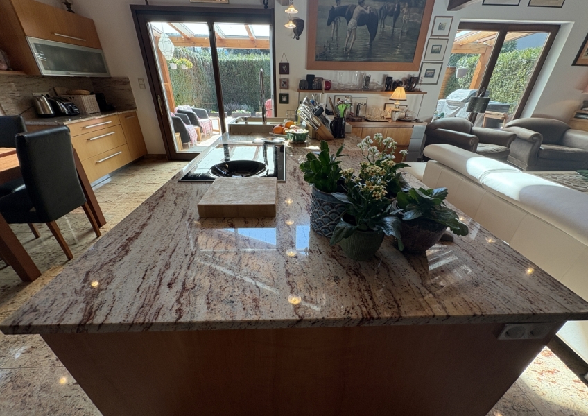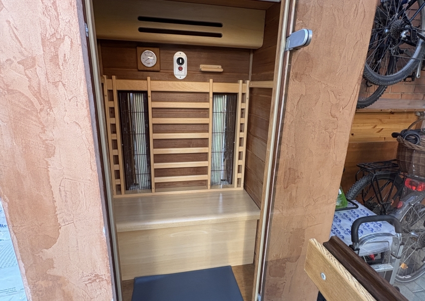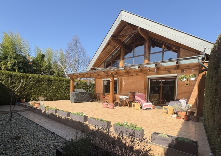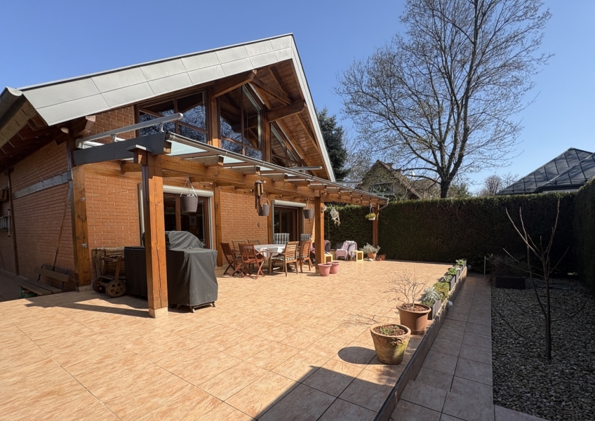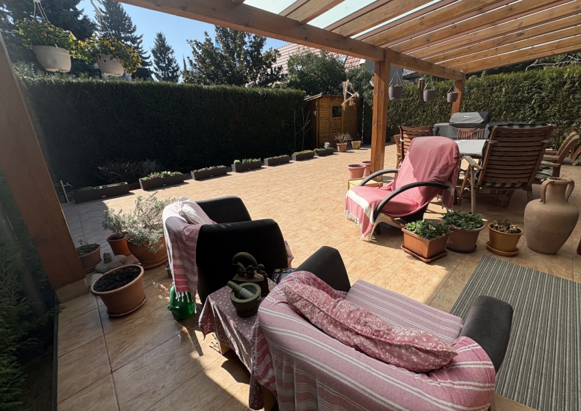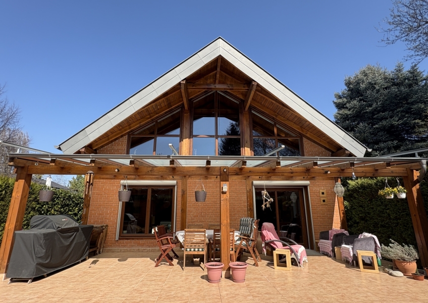 In addition to the net 126 sqm building, there is an infrared sauna cabin and a unique new Finnish sauna house in the garden to complete the wellness experience, as well as a storage room that also functions as a summer kitchen, and a second bathroom. Other extras include a camera system, alarm system and water softener. The covered parking area offers space for 4 cars. Two entirely separate houses are located on this plot, 400 sqm of the area is used by the owners of this house. This area is both physically separated (by a fence) and legally separated by a division agreement submitted to the land registry.