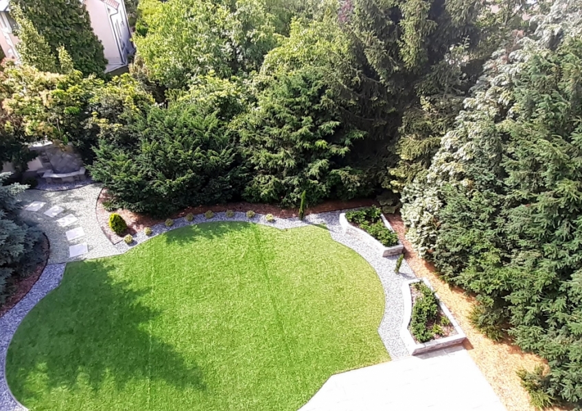 The detached building is located on a 950 sqm, beautifully landscaped, intimate, English-style, ancient tree-lined, sloping plot surrounded by many large evergreens. The special atmosphere of the garden comes from various romantic wells and other wonderful and unique structures. The spaces of the building are huge on all levels, floating in a flood of light thanks to their huge windows and glass surfaces.