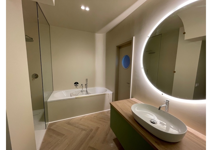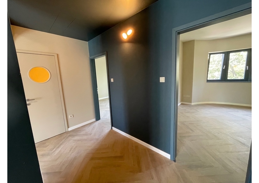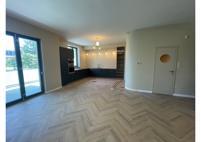 Első emeleti lakás: 110 nm + 30 nm terasz, nappali - amerikai konyha + 2 hálószoba, exkluzív fürdőszoba káddal, WC-vel és WC - mosókonyha helyiség (szintén felszerelve), továbbá egy bebútorozott járható gardrób.