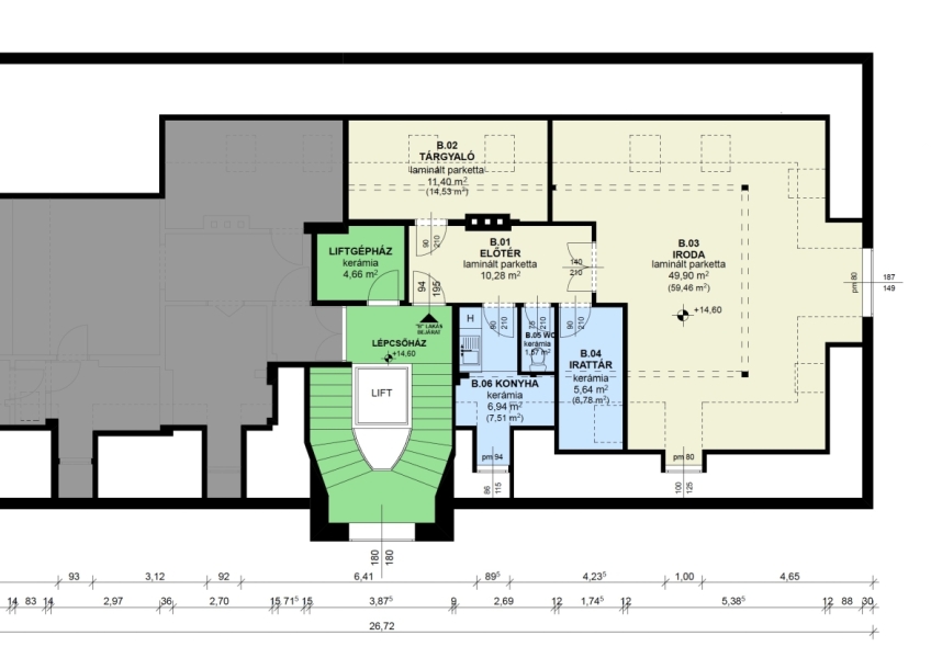 Elegáns homlokzatú házban tetőtéri 86 m2-es irodaterület várja bérlőjét. Az iroda helyiségei: egy nagylégterű iroda helyiség, egy tárgyaló, egy irattár, konyha és wc.